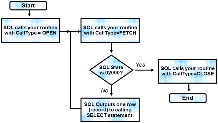 The diagram in Figure 3 shows the flow of events for a UDTF. First, SQL calls your program with open, then calls it repeatedly with fetch until you return an SQL state of 02000, and finally it calls the program with close.